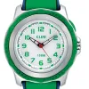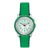 Das Armband der Uhr ist aus grünem Gummi.