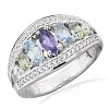 mehrfarbigem Ring aus Silber mit polierter Oberfläche und mehrfarbigem synthetisch Amethyst mit Facettenschliff und weißem Zirkon mit Facettenschliff.