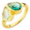 grünem Bergkristall Ring aus vergoldetes Messing mit polierter Oberfläche und hellgrünem Bergkristall mit Facettenschliff und grünem Bergkristall mit Facettenschliff.