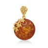 großer runder Bernstein Anhänger aus vergoldetem Sterlingsilber mit polierter Oberfläche und 1 Cognac gefärbt Bernsteinen mit Cabochon-Schliff.