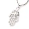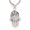 Hamsas Hand Anhänger aus Silber mit polierter Oberfläche und 2 weißen Zirkonen mit Facettenschliff.
