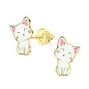 Katzen Kinderohrringe in vergoldetem Silber mit polierter Oberfläche und glatt weißem Emaille und glatt pink Emaille.