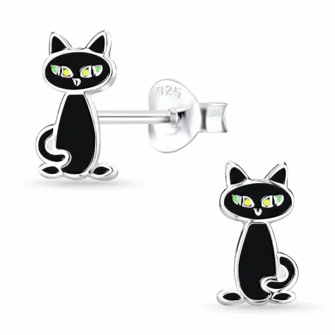 Katzen Kinderohrringe in Silber mit polierter Oberfläche und glatt schwarz Emaille und glatt gelbem Emaille und glatt grünem Emaille.