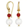 lange pink Bergkristall Ohrringe in vergoldetem Silber mit polierter Oberfläche und 2 glatt pink Bergkristallen 2 weißen Perlen.