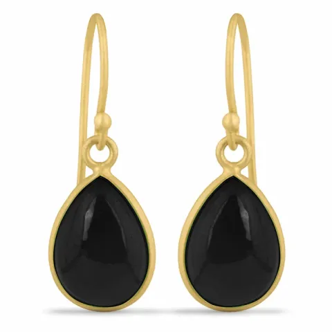 lange schwarzem Onyxe Ohrringe in vergoldetem Silber mit sandgestrahlter Oberfläche und 2 Cabochon-Schliff schwarzen Onyxen.