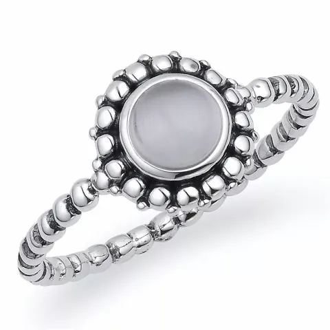 Ring aus oxidiertem Sterlingsilber mit polierter Oberfläche und 1 weißen Katzenaugen mit Cabochon-Schliff.