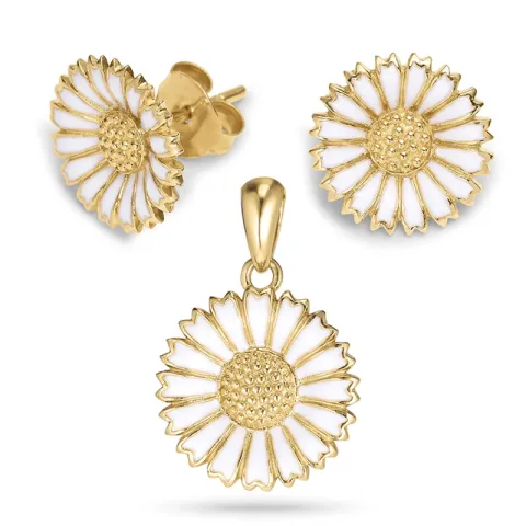 Marguerite Set mit Ohrringe und Anhänger in vergoldetem Sterlingsilber mit und glatt weißem Emaille.