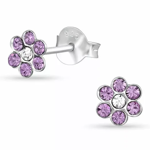 Blumen Ohrringen für Kinder in Silber mit polierter Oberfläche und 2 Facettenschliff weißen Bergkristallen und 12 Facettenschliff fliederfarbenen Bergkristallen.