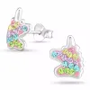 Einhorn Ohrstecker in Silber mit polierter Oberfläche und 30 Facettenschliff mehrfarbigen Bergkristallen.