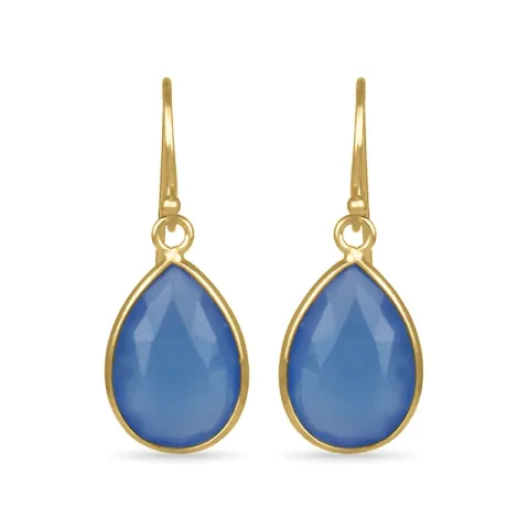 Tropfen blauem Ohrringe in vergoldetem Sterlingsilber mit sandgestrahlter Oberfläche und 2 Facettenschliff blauen Chalzedonen.