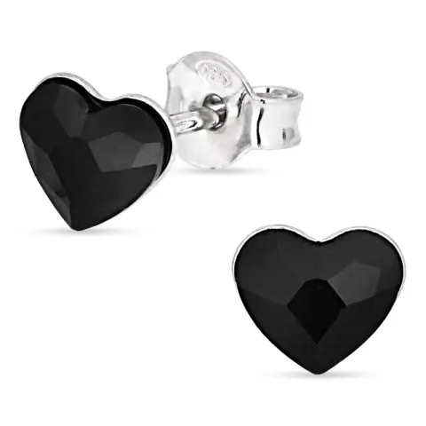 schwarzem Herz Ohrringe in rhodiniertem Silber mit polierter Oberfläche und 2 Facettenschliff schwarzen Bergkristallen.