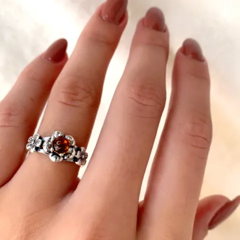 Blumen Bernstein Ring aus Silber mit polierter Oberfläche und 1 braunen Bernsteinen mit Cabochon-Schliff.